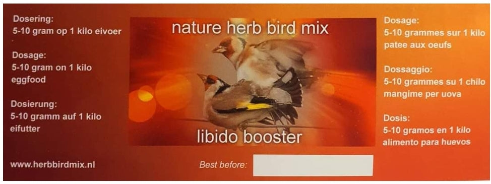 TIP: voer LIBIDO BOOSTER mix langzaam op onder je eivoer. eerst 1x in de week daarna 2x in de week. zo zorg je ervoor dat zowel man als pop in super broedconditie komen. tijdens het eieren leggen stop je met geven van libido booster kruiden. tussen elke ronde door weer libido booster kruiden geven zodat de vogels de booster krijgen van libido en vitamines.