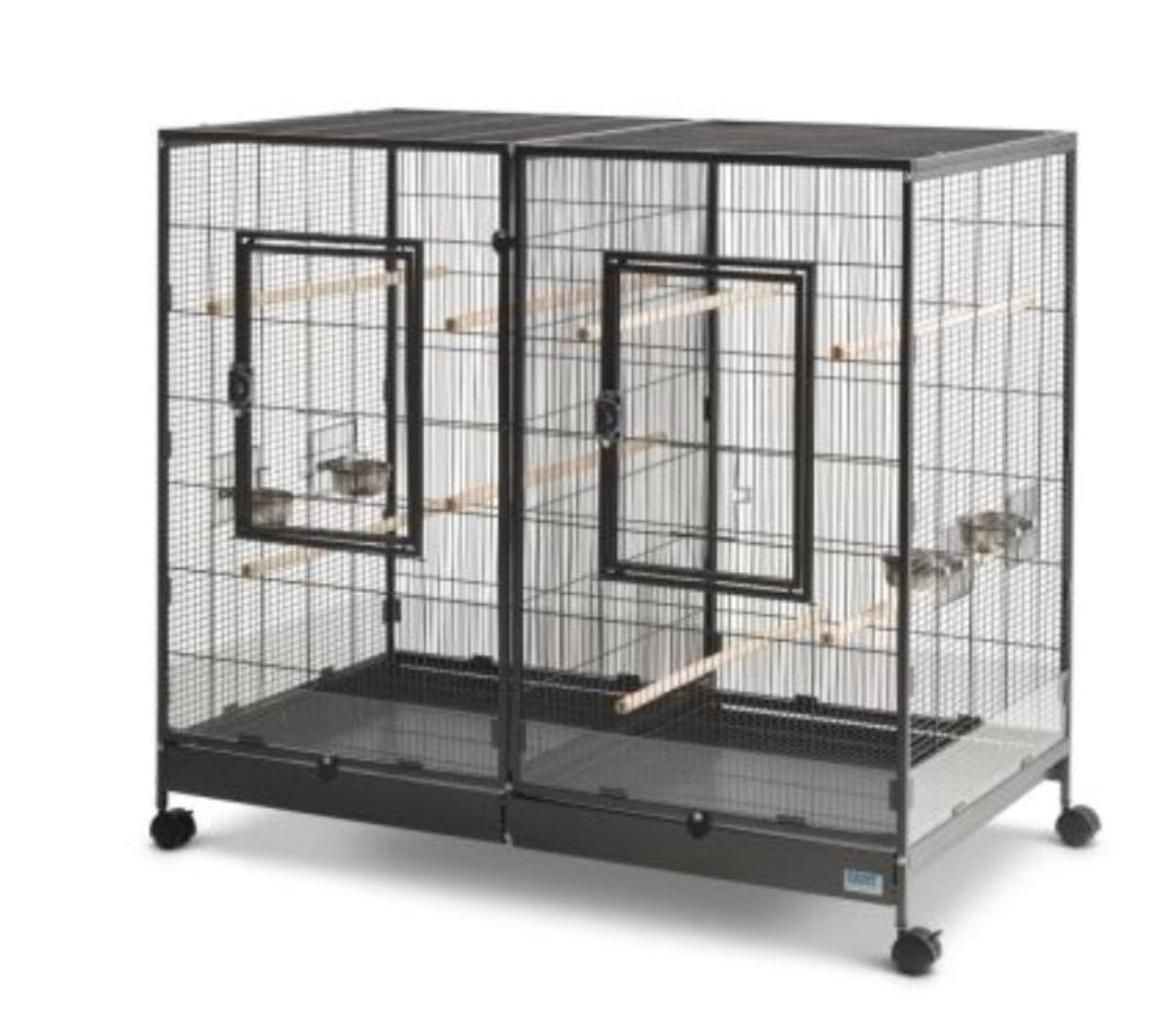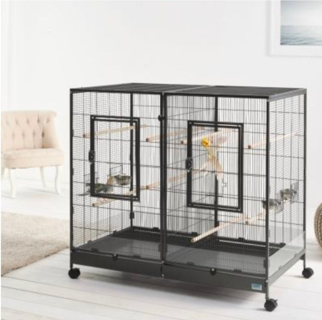 Volière met uitneembare afscheiding. Ideaal voor meerdere kanaries & parkieten. Met 2 bodembakken, bodemraster, praktische deurtjes, 8 zitstangen en 4 voerbakken.